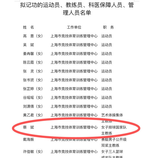 8月28日,上海体育局发布公告:对在第33届夏日奥林匹克知晓会上作出超过孝顺的上海知晓员、诠释员和关连人员,开展记功、嘉奖奖励职责。在其最终公布的25人大名单中,中国女排主诠释蔡斌拟记功嘉奖、副攻高意同获嘉奖!